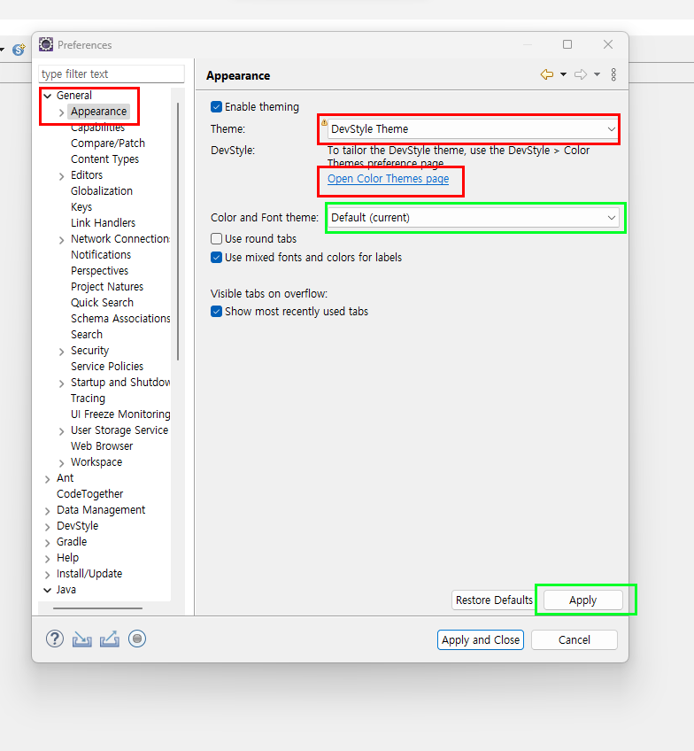 Color and Font theme에서 원하는 것을 골라 Apply 버튼을 클릭하면 된다.