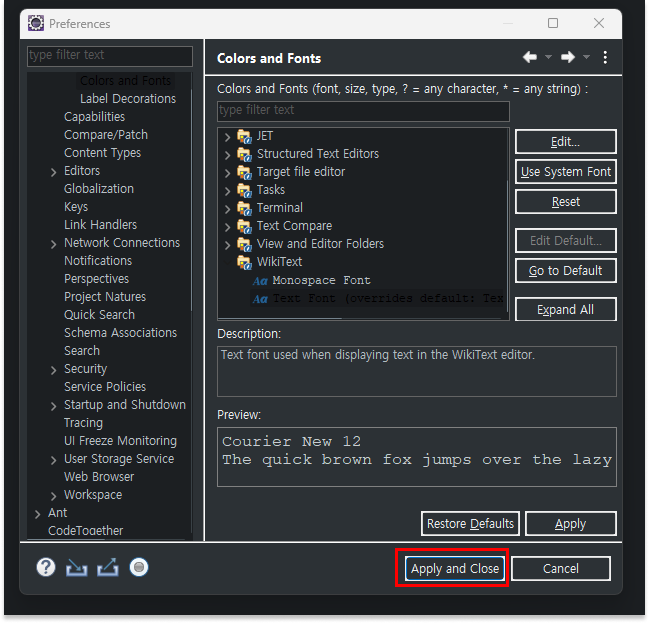 폰트 설정이 끝났다면 Apply and Close 버튼을 클릭한다.