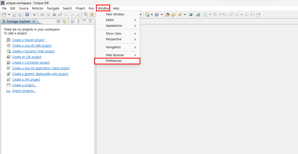 테마 설정할 때와 똑같이 Window > Preferences 를 클릭한다.