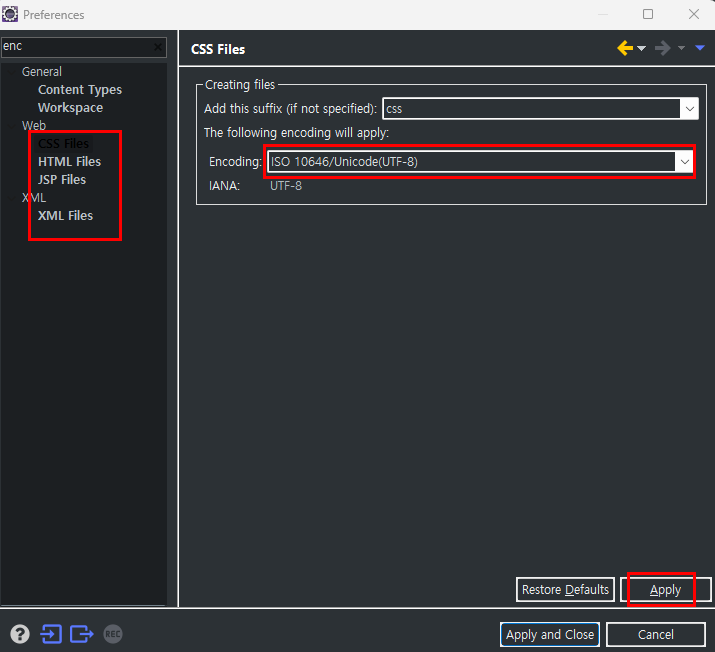 더 이상 Preferences에서 설정할 것은 없으므로 Apply and Close 버튼을 클릭한다.