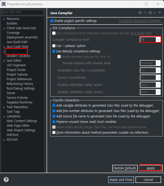 본인의 JDK 버전에 맞춰 오른쪽의 Compiler Compliance level의 숫자를 변경해주고