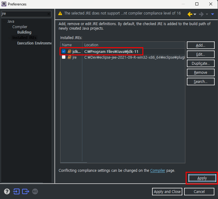 추가해준 jdk의 체크박스를 클릭하여 체크 표시를 남기고 Apply 버튼을 클릭한다.