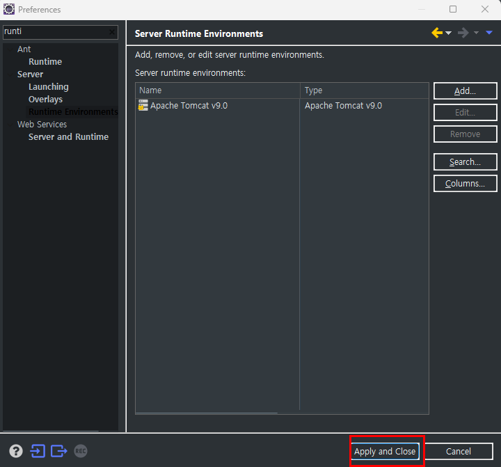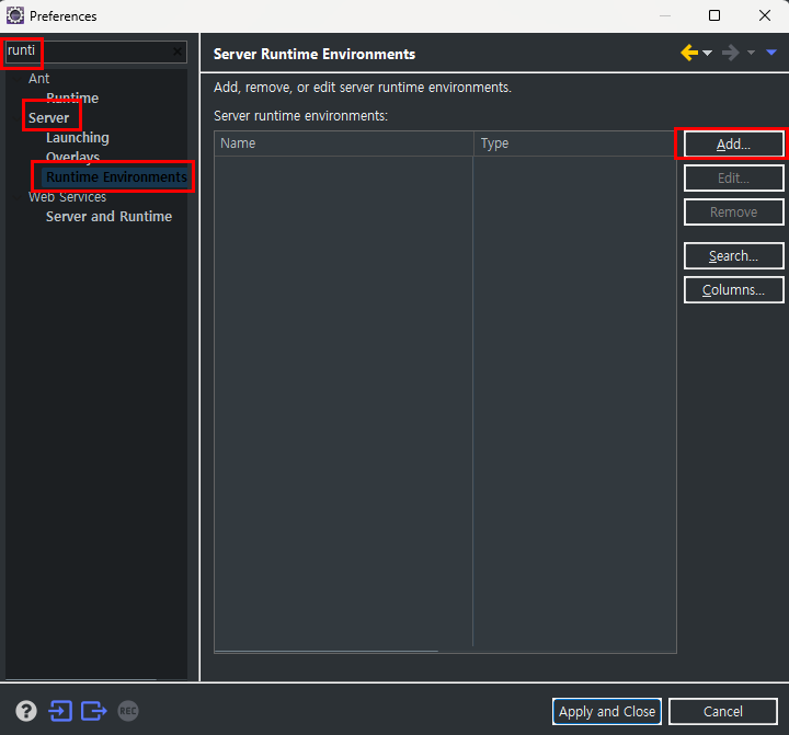runti를 검색하여 Server > Runtime Environments를 클릭하여 오른쪽의 Add 버튼을 클릭한다.