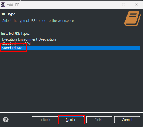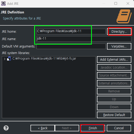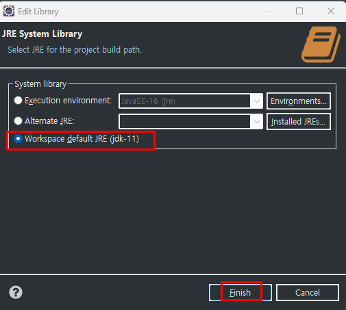 Workspace default JRE (jdk-본인이 사용하려는 버전의 숫자가 적혀 있어야 한다)를 선택하고