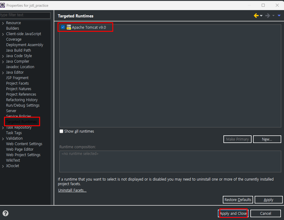 마지막으로 좌측메뉴에서 Targeted Runtimes를 클릭하여 Apache Tomcat v9.0에 체크가 되어있는지