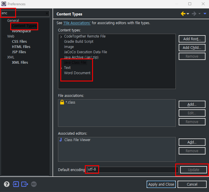 위의 3가지를 각각 클릭해 하단의 Default encoding에 utf-8을 입력하고 Update 버튼을 클릭한다.