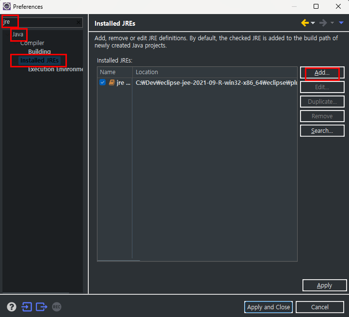 검색창에 jre를 입력하고 Java >Installed JREs를 클릭한다.