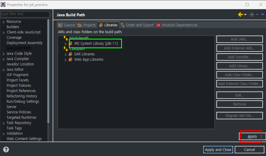 좌측 메뉴에서 Java Build Path를 클릭하여 Libraries 탭을 선택하고