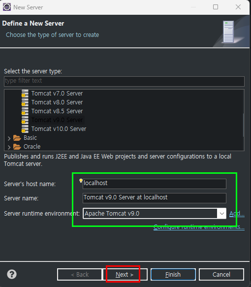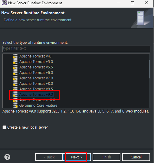 본인이 다운로드 받은 Tomcat의 버전과 일치하는지 확인하고 Next 버튼을 클릭한다.