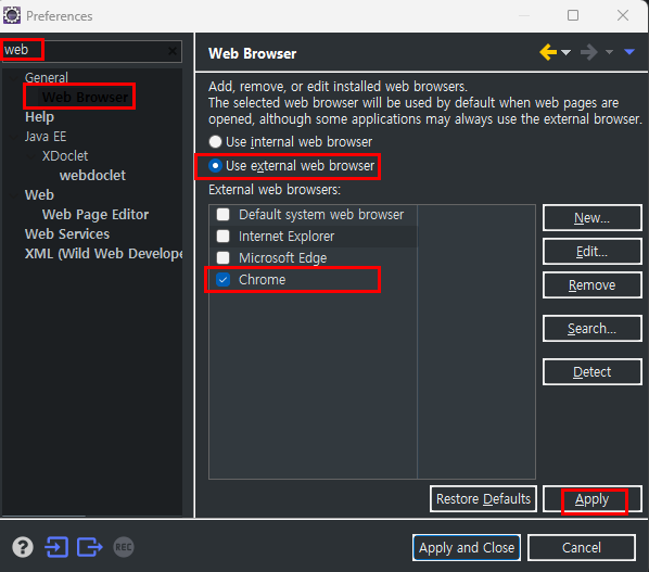 web을 검색하여 General > Web Browser에서 Use external web browser를 선택하고