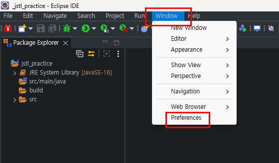 Dynamic Web project 생성을 완료했다면 상단바의 Window > Preference에서 설정을 시작한다.