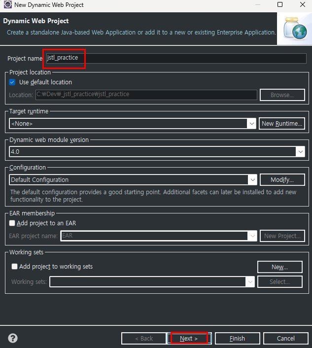 나는 Project Name을 jstl_practice라고 입력해주었다.