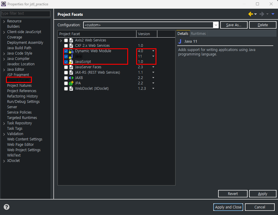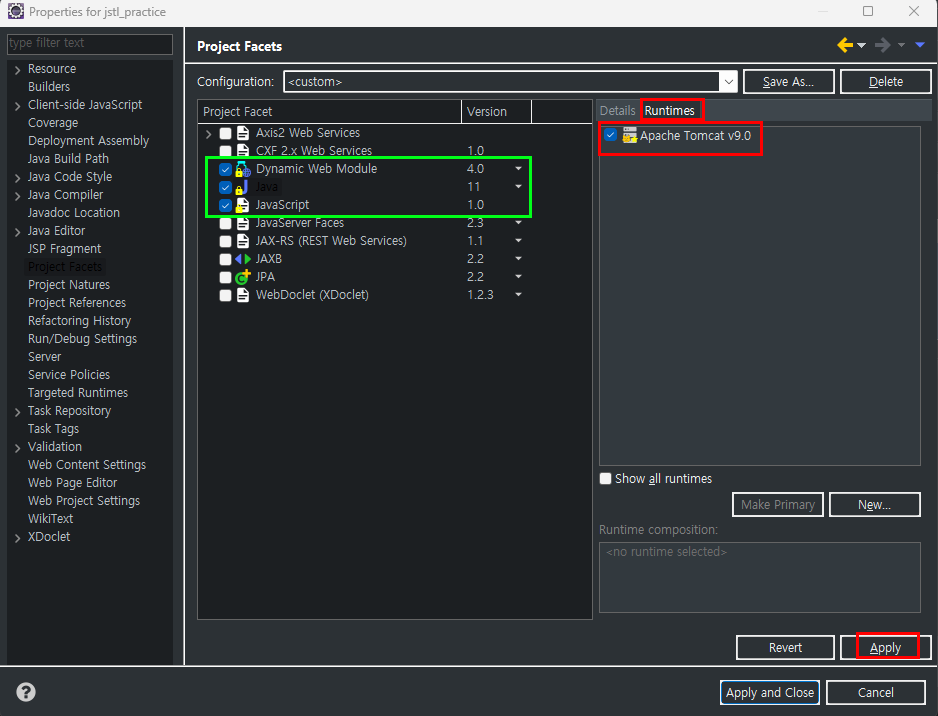 만약 체크되어있지 않다면 방금 전에 설정하고 왔던 Project Facets에서 Rumtimes에 체크해두지 않아서