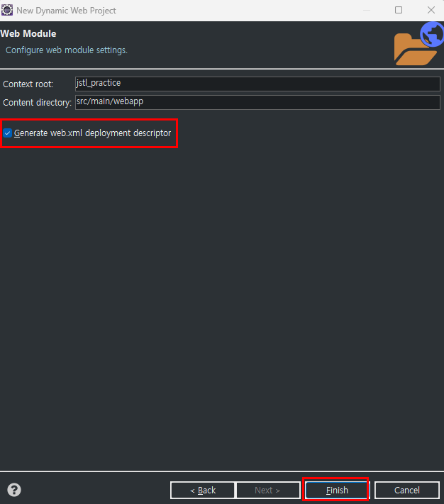 Web.xml을 생성하기 위해 체크박스를 클릭하고 Finish 버튼을 클릭한다.