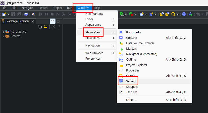 상단바에서 Window > Show View > Servers를 클릭해서 Servers 창을 열어준다.