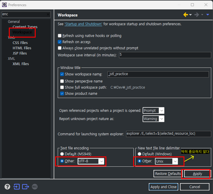이때 New text file line delimiter의 설정은 크게 중요하지 않다.