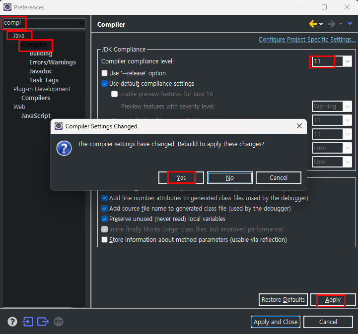 그 다음은 compi를 검색하여 Java > Compiler를 클릭한다.