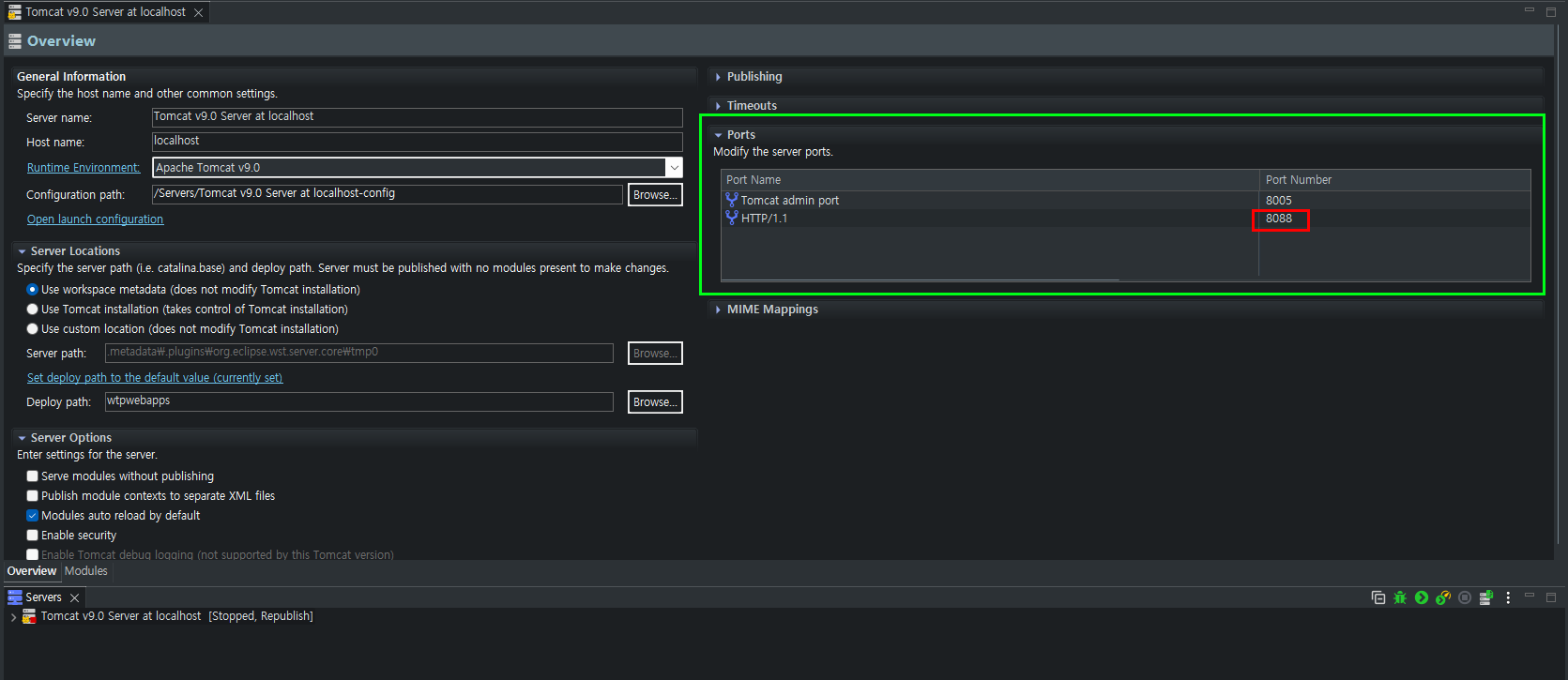 오른쪽의 Ports에서 HTTP/1.1에서 값을 더블클릭하여 8088로 수정한다.