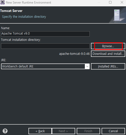 Browse 버튼을 클릭하여 다운로드 받은 Tomcat의 경로를 설정한다.