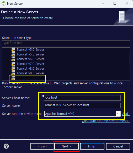 본인 tomcat 버전이 맞는지 확인하고 Next 버튼을 클릭한다.