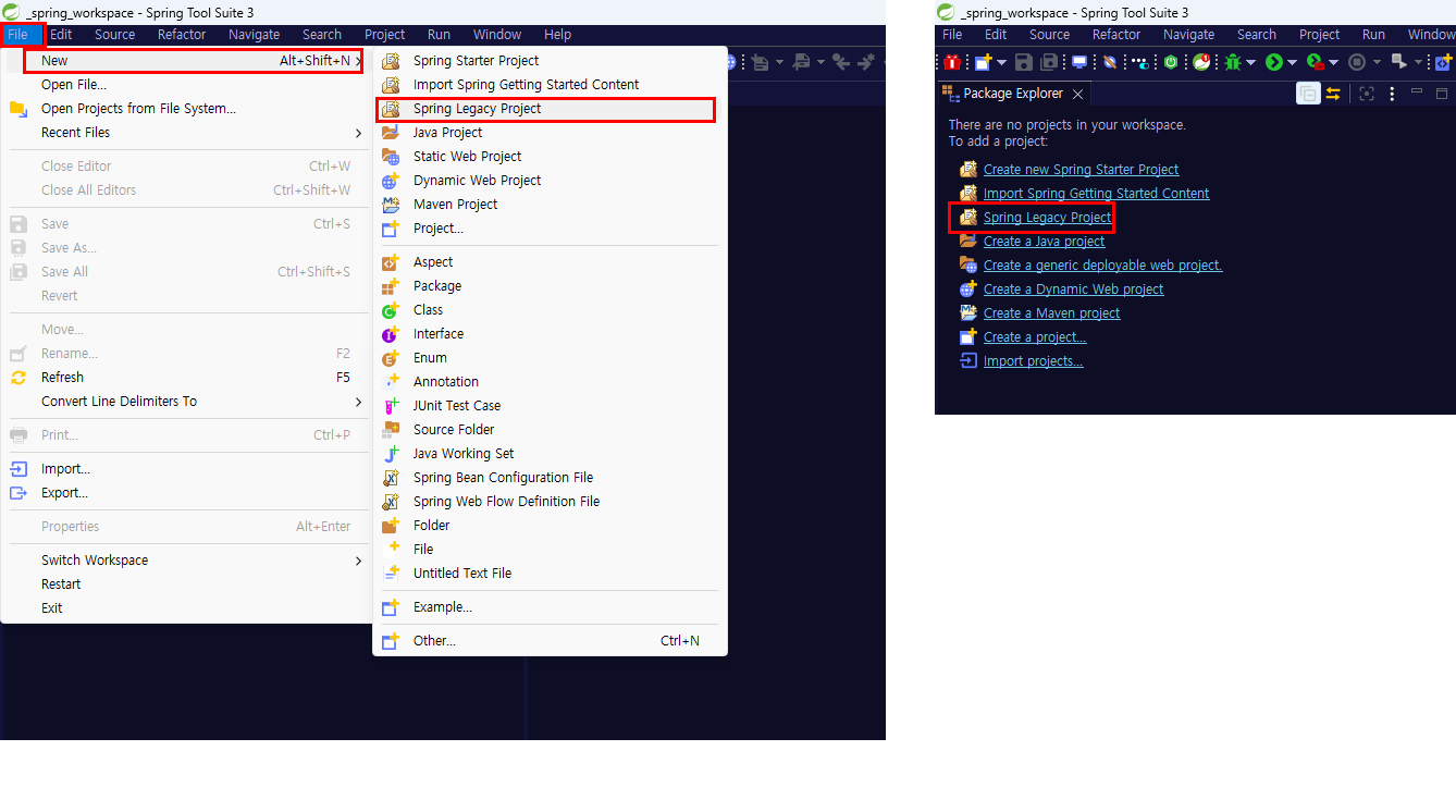 다른 방법으로도 생성 가능한데, Package Explorer에서 Spring Legacy Project를 클릭하거나