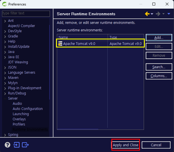 Tomcat이 추가된 것을 확인하고 Apply and Close 버튼을 클릭한다.