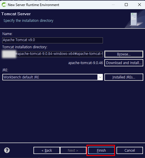 본인이 다운로드한 Tomcat의 경로를 찾아 폴더를 선택한다.