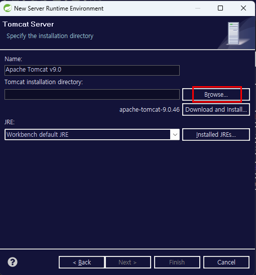 본인이 다운로드한 Tomcat버전을 선택해 Next 버튼을 클릭한다.