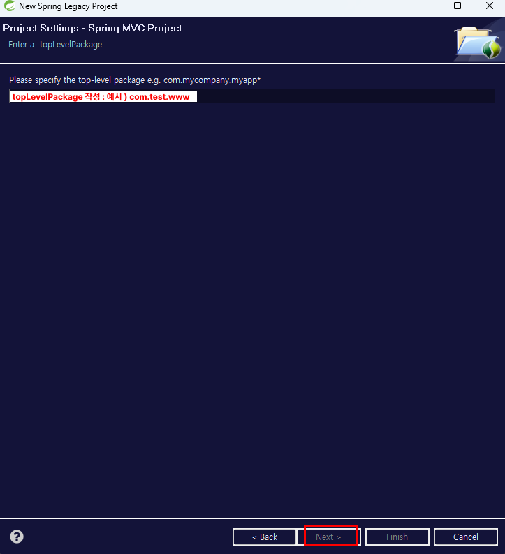 다운로드가 끝나면 상위 패키지 이름을 작성해야한다.