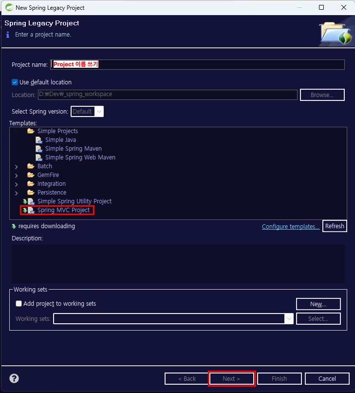 Project 이름을 작성하고 Templates에서 Spring MVC Project를 선택한다.