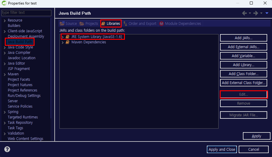 JRE System Library를 선택하고 Edit... 버튼을 클릭한다.
