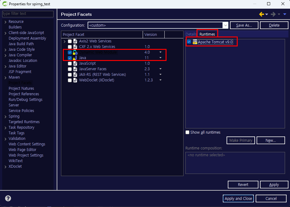 그 다음 Dynamic Web Module을 선택한 뒤 오른쪽에 Runtimes 탭을 클릭하고