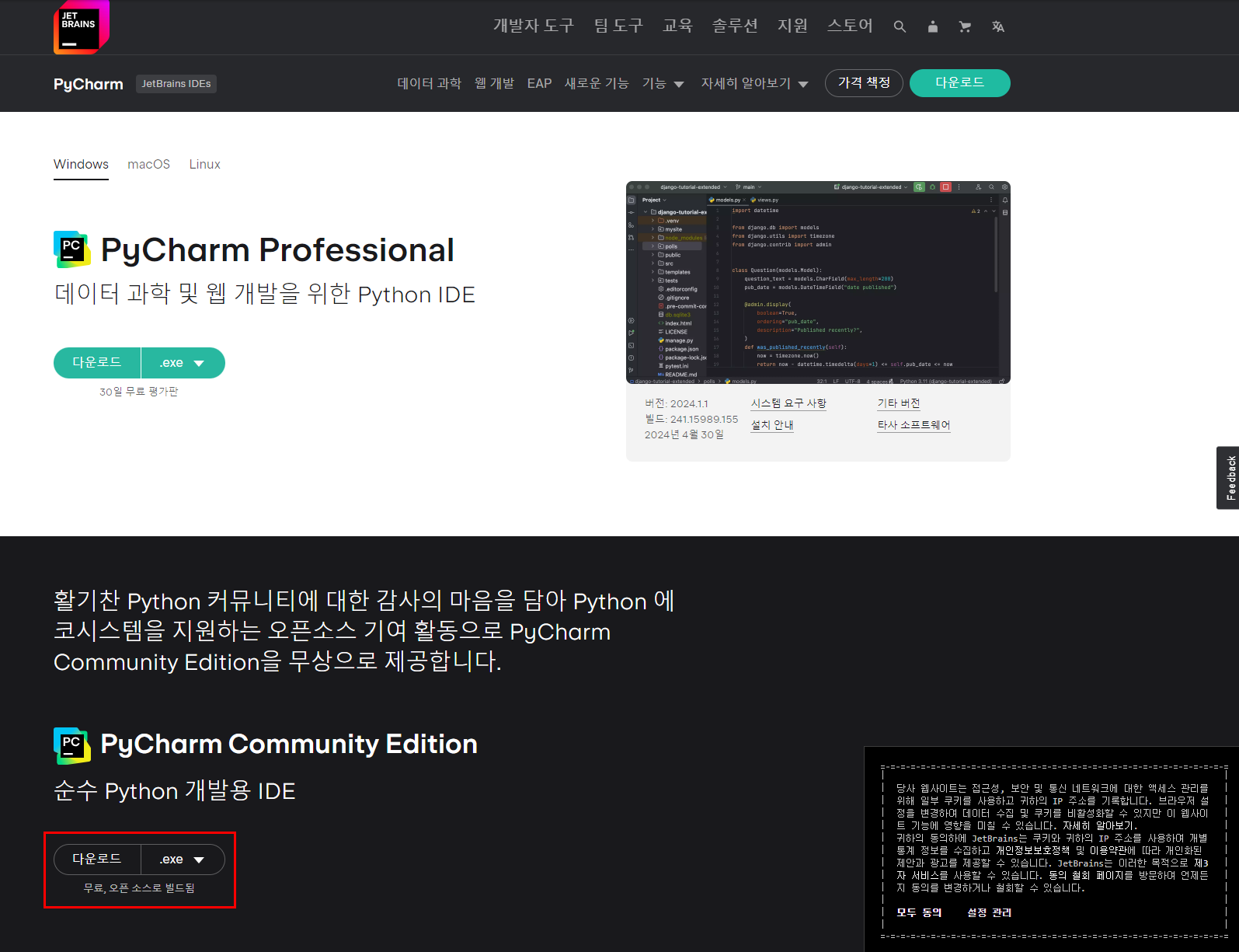 PyCharm 다운로드를 위해 https://www.jetbrains.com/ko-kr/pycharm/download/?section=windows 사이트에 접속한다.