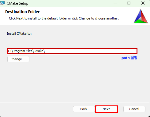 시스템 환경변수에서 PATH를 직접 설정하기 싫어서 Add Cmake to the PATH environment variable를 체크해 주었다.
