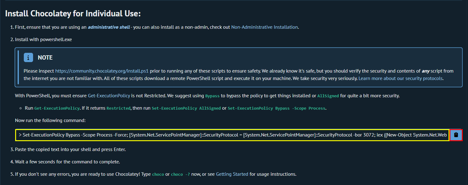 Set-ExecutionPolicy Bypass -Scope Process -Force; [System.Net.ServicePointManager]::SecurityProtocol = [System.Net.ServicePointManager]::SecurityProtocol -bor 3072; iex ((New-Object System.Net.WebClient).DownloadString('https://community.chocolatey.org/install.ps1'))