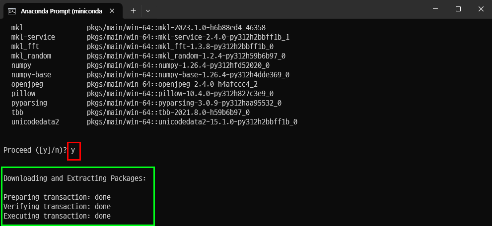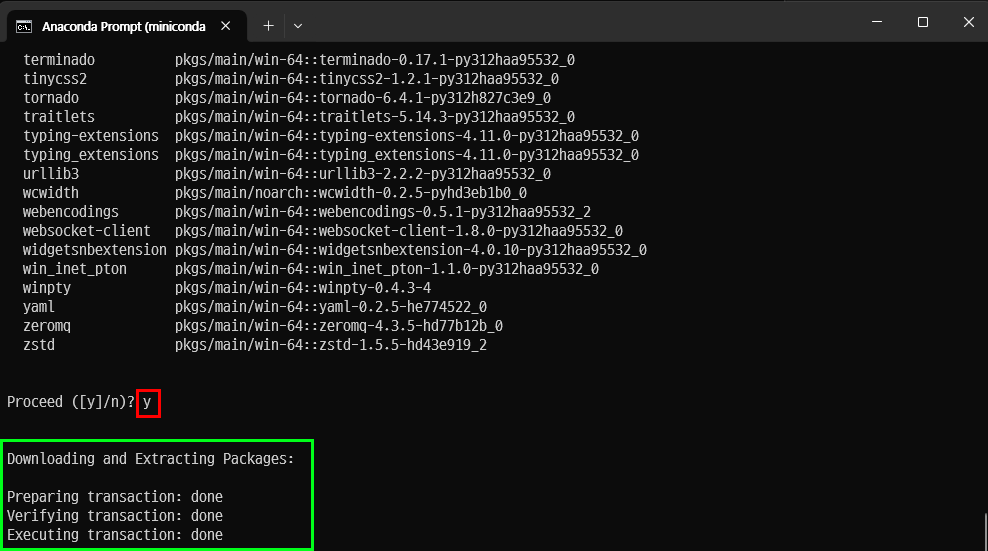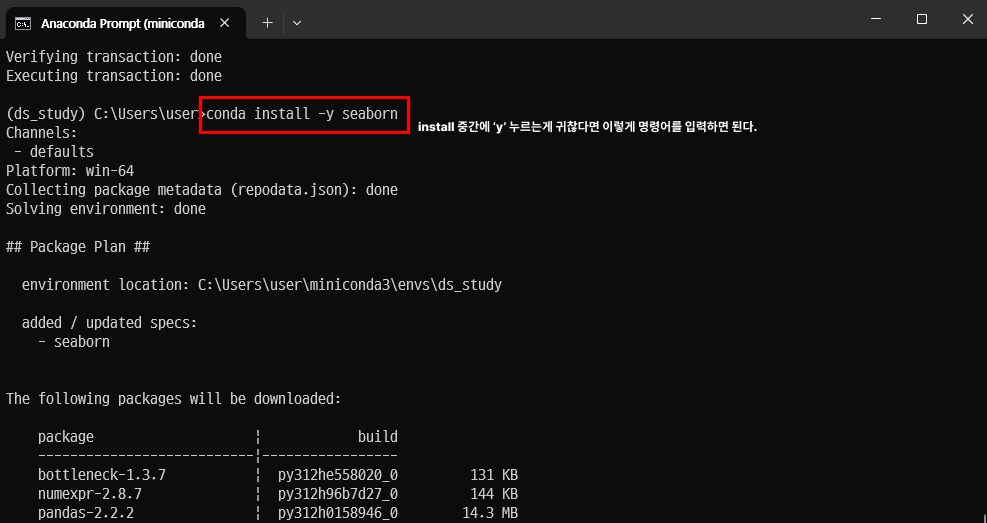install 중간에 'y'를 누르는게 귀찮다면 'conda install -y'로 명령어를 입력해주면 된다.